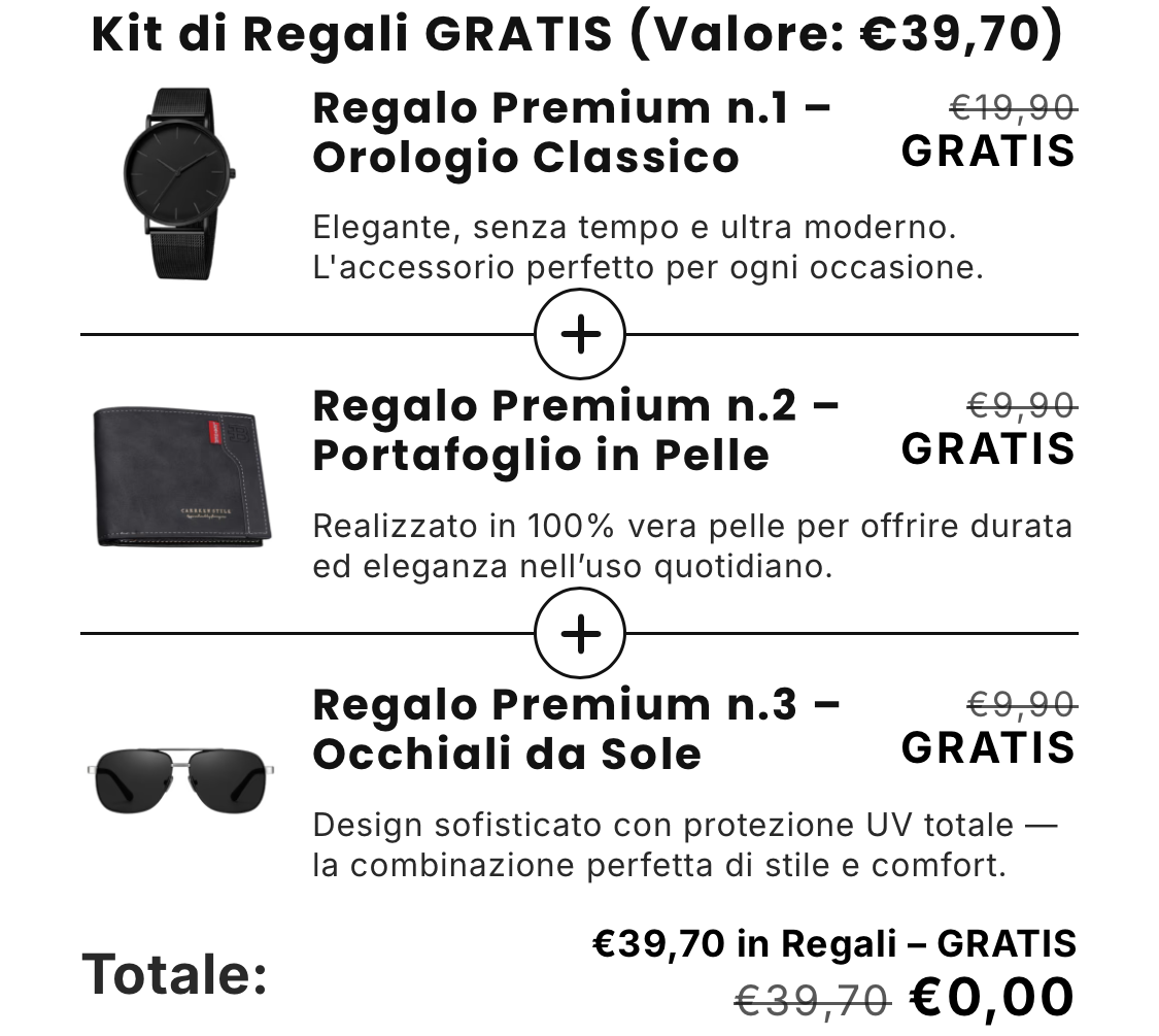 Recibí una billetera, un reloj y unos lentes de sol totalmente GRATIS con tu compra.